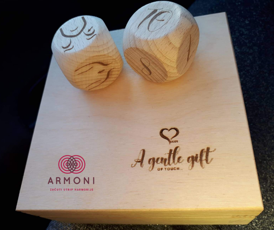 Podarita si trenutke nežnega dotika drug z drugim in v vajin odnos prinesita malo igrivosti. Izmenjaje mečita kocke HeartSees in z njihovo pomočjo izberita del telesa, ki ga bosta masirala in minute trajanja masaže. Deli telesa, ki jih bosta masirala so zatilje in vrat, stopala, obraz, ramenski obroč,dlani ter hrbet. Masaže posameznega dela telesa pa bodo trajale v razponu med 5 in 10 minut.